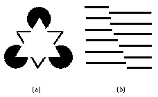 輪郭は普通,視野内に明るさや色などに物理的不連続がある場合に知覚されるが,主観的輪郭はそのような不連続のないところに形成される輪郭である.例えば図1(a) の中心にあるように見える三角形(Kanizsa の三角形 (Kanizsa, 1979) と呼ばれる)や (b) の中を通る縦の線などは主観的輪郭である.
