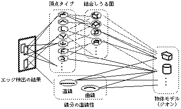 画像上の輪郭からの手掛かりは,輪郭が1点に集まる頂点の形(L 型,Y 型,矢印型など)と,輪郭が直線か曲がっているかである.これらの特徴は立体の物理的な形に制約されているので,視点が少し変わってもあまり変化しない,安定した特徴である.