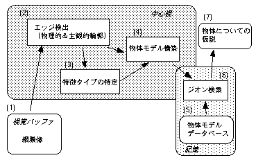 図8は主観的輪郭を含めた3次元物体認識システム TORES-BM (Three dimensional Object REcognition System by Biological Model) 全体の概念図である.網膜像は (1) 視覚バッファを通して入力され,まず (2) 明るさのエッジ検出を行なう.これには3章で説明した BCS のアルゴリズムを用いる.次に (3) 検出されたエッジ(輪郭)をグループ化して,3次元形状の手掛かりとなる特徴(頂点,線分など)がどこにどんな種類があるかを特定する.その特徴の種類を基にして (4) 3次元の物体モデルを構成する.(5) 記憶に表象されている物体モデルのデータベースを備え,(6) それに基づいて要素立体(ジオン)を検索,(7) 見ている物体が何であるかを同定することによって認識する.これらの処理は人間の処理方式にならって視野の中で中心視された領域でのみ行なわれると考えている.