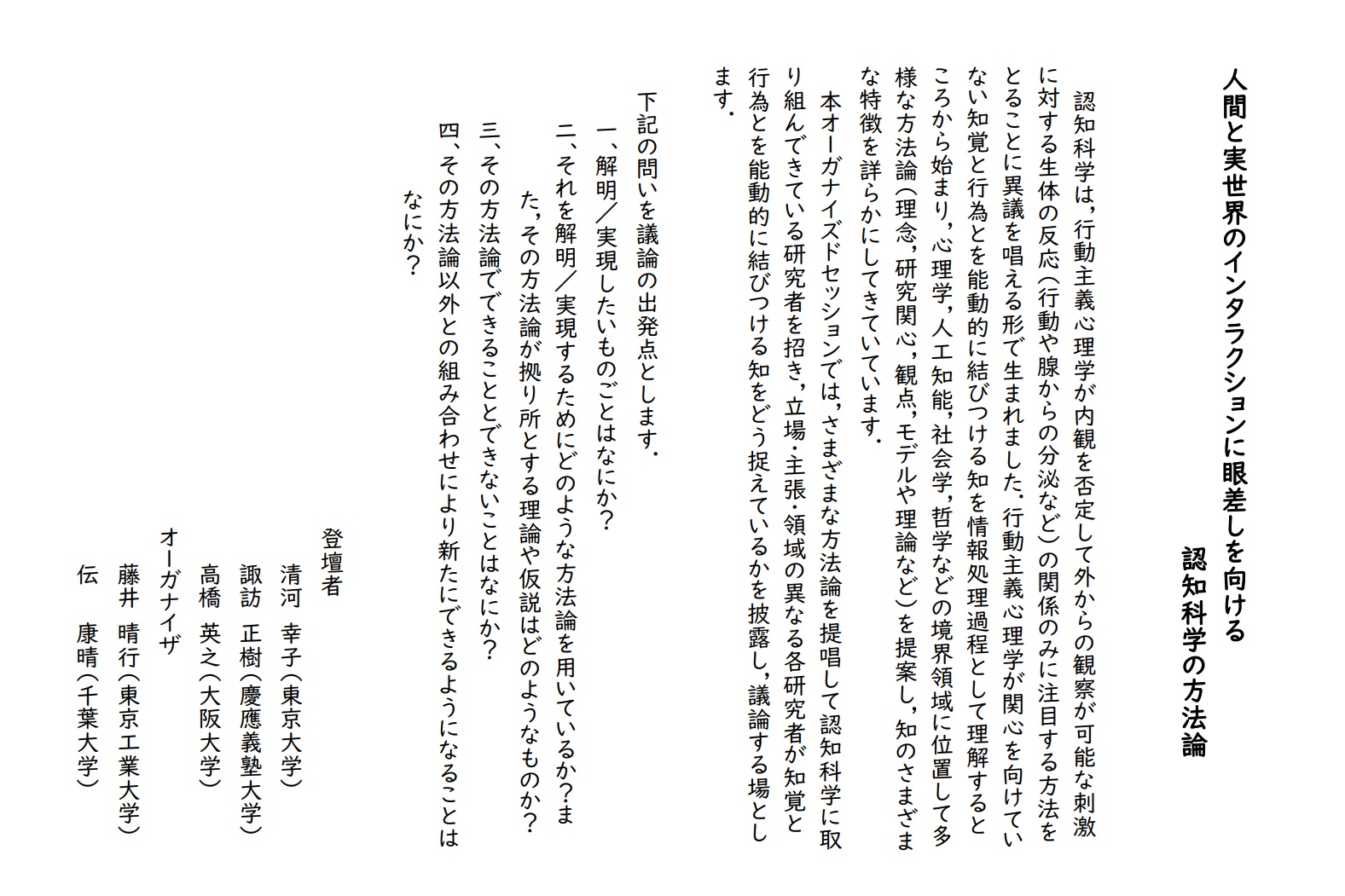 オーガナイザー:久保(川合)南海子(愛知淑徳大学),岡田浩之(玉川大学),開一夫(東京大学)